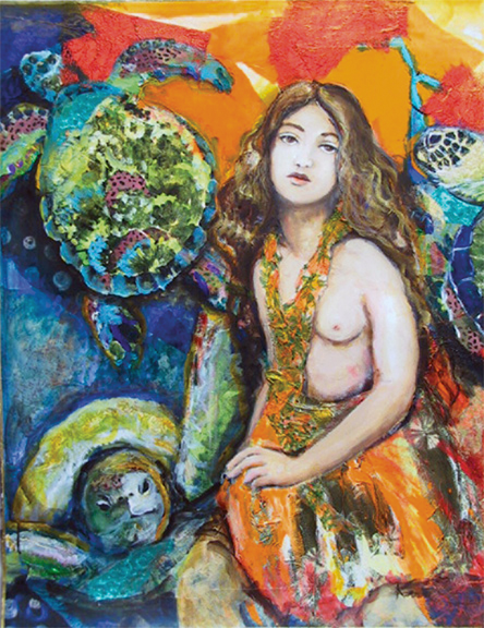 These wern’t little turtles, like the snapping turtles at Lake Lida, MN, that terrified me when I was a kid. These were 300 pound amazing creatures that lived wild in the mystery of the ocean deep. I started pulling slime off the rocks and pretty soon I had maybe 3 or 4 massive bodies in front of me eating out of my hand. I couldn’t resist sneaking feels of their muscular fins while they munched happily and unafraid. Being all consumed by this moment of pleasure, I didn’t notice that I was soon surrounded and finding it difficult to keep my footing. One of the turtles, behind me decided to let me know that he was waiting, impatiently, and took a little bite out of my calf. Fun time was over and I bid these mystical beings a farewell. I later purchased a postcard of a young Hawaiian girl. It was probably taken in the 30s or 40. She wasn’t wearing a top and, though she gazed out in unabbashed innocence, she had this “old soul” look about her. She became the model for my painting and friend to all turtles.