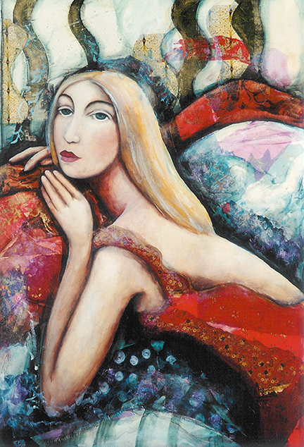 Forever Love II is a mixed media painting (acrylic paint, imported papers, gold leaf and Caran Dache) on Somerset textured print paper. The image measures 44″ x 30″ and is professionally framed under plexi-glass.