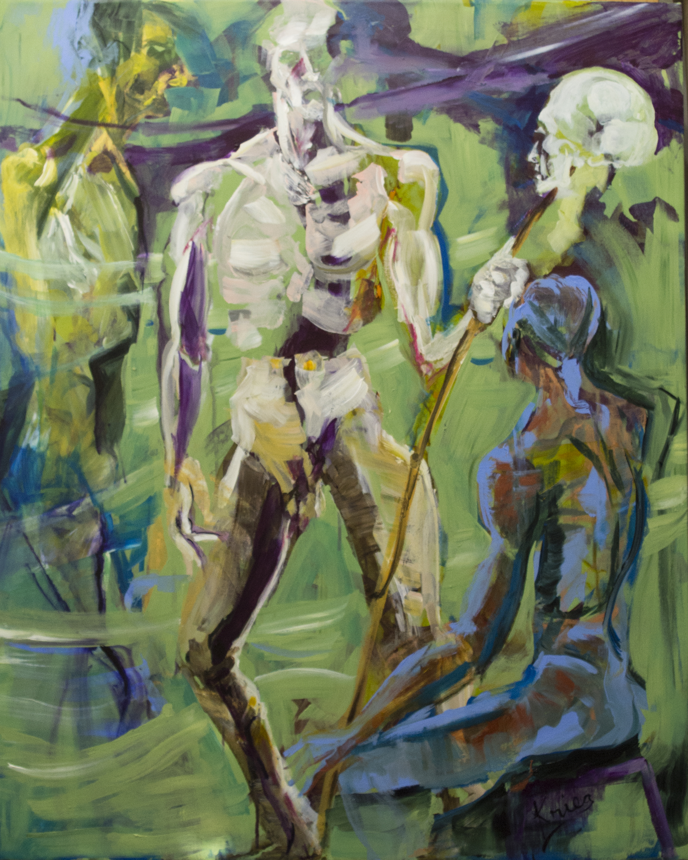 This is one of those painting, for me, that falls together moment by moment without any planning. There’s a communication between the painting and myself. At the end of this relationship with it, it stands alone with a specific statement of emotion. I had a stretcher bar 30″ x 24″, I had green paint that needed to be used. The model was a skinny older man and as he took various poses, they arranged themselves into a conversational circle on the canvas. Each pose was maybe 20 minutes long. I captured as much as I could. He held a staff in the final pose. What did it mean. It seemed biblical. Maybe the stance a warrior might take, or the feeling of sorrow after a battle. Yes, I feel what he’s feeling when I look at the world news, the local news, the political news and the ignorant statements of politicians. Get it right for once!