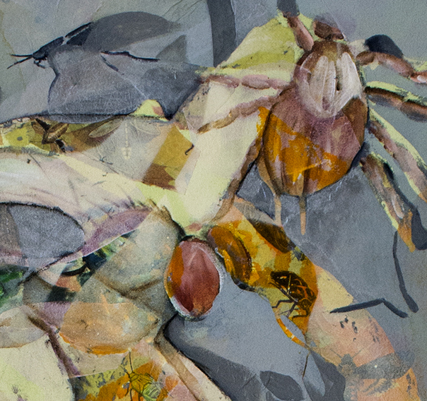 When I showed the painting to Robert, he wouldn’t let me get away without telling the story so here it is: I have a distaste for some bugs. Who doesn’t right? In this painting I created portraits of the one’s I find icky, creepy, mean and dangerous, hoping to overcome my fears and repulsion. It reminded me of an experience I had 10 years ago in Ojai California. I went to an animal communicator class and the instructor told us to close our eyes and imagine our spirit animal – just let it come to you she said. All of a sudden I heard distant screaming and wondered what was making the noise. Oh no, please don’t let it be! My spirit animal was not turning into a lion or something cool, it was turning into a cockroach. I forced myself to go with the imagination and followed the screams to the masses of cockroaches. As I got closer they weren’t really screaming, they were saying cleaning, we’re cleaning, we’re cleaning. I realized I shouldn’t really hate them for doing their job. They were cleaning the eco system, breaking down organic debris and in the process adding nutrients to the soil .