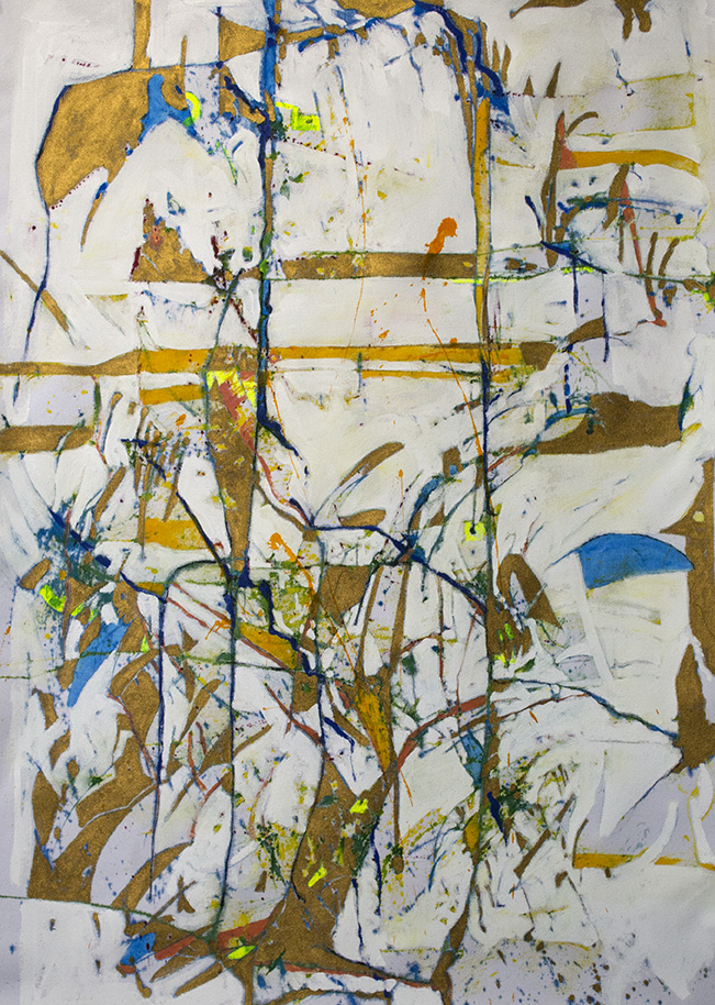 ‘Broken Barriers’ was the second of three abstracts. It was created in response to the walks I had to take with the dog. We lived in an apartment complex with a couple hundred strangers. While my husband and I were in the category of “at risk”, we felt a daunting sense of stress. There was a constant paranoia. The dog had to go out for long walks. My beautiful Katja insisted on it, even though she has potty papers. Many people here rejected wearing masks and social distancing. This painting exemplifies our walks while dodging and trying to avoid people, whether contaminated or not by unseen viruses. Leaning towards “germaphobe”, all my barriers and my personal space were broken on these walks. It’s a strange violation, like stop sharing my air. Certainly an unhealthy feeling that adds to the sense of separation from others and one’s environment.