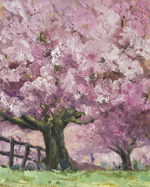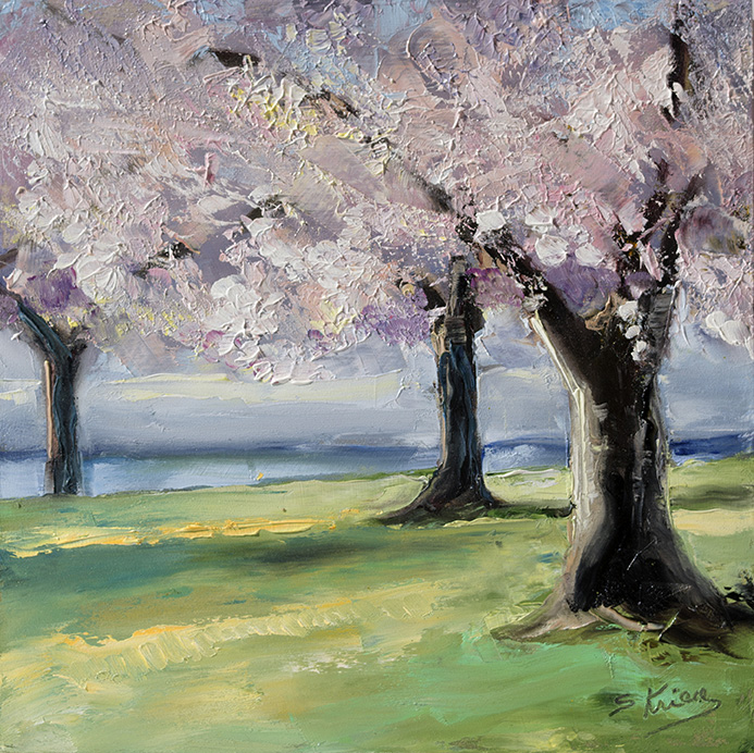 I was disappointed that I couldn’t see the beautiful cherry trees at my son’s home. So, he sent me photos. I painted ‘The Power of Spring’.