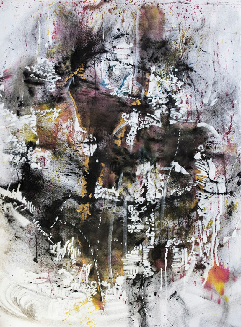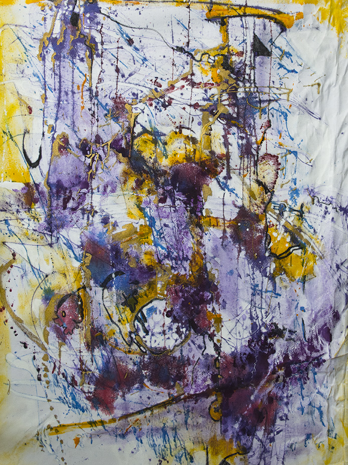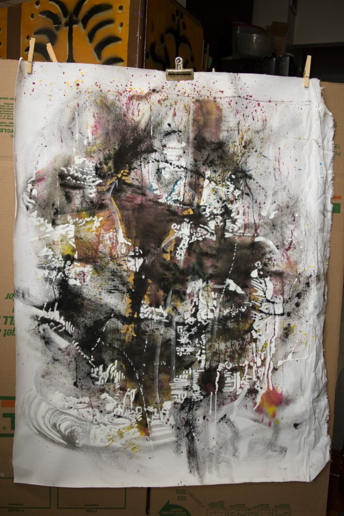 The thing an artist does to combat stress is to make art. I started doodling in my sketchbooks, but the paper was too thin, too small and unfulfilling. While sorting through materials in my studio, I found some weird canvas. I had never used it because it seemed too much like paper. I cut it into thirds, each roughly measuring 36” x 30”. I also had a bag of unopened printer ink cartridges that I needed to dispose of. I wondered if it would work to break into the cartridge and get the ink out. Straight from the cartridge I was able to make satisfying marks and splotches.