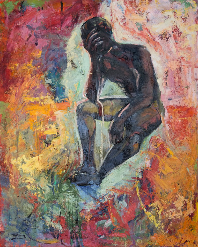 It’s a stark reality. In the US, 1 out of 5 people are expected to get some form of cancer. My husband was diagnosed in June of 2019 and has been receiving chemo infusions every other week since then. Cancer is horrible and chemo is horrible; filled with a roller coaster ride of emotions, from despair to hope. My husband has lost around 70 pounds since this all began. I’m dedicating this painting to him. It represents all the emotions, pain, and self-discovery he has gone through.