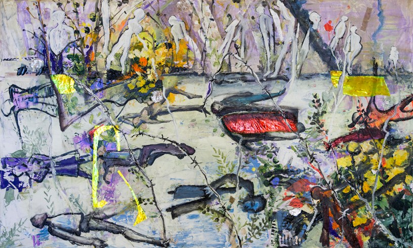 The painting is mixed media (acrylic, oil and collage) on stretched canvas 18” x 30”. The image is painted around the edges and does not require framing.