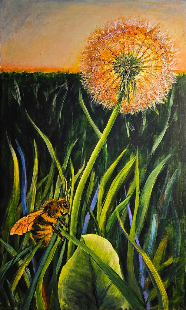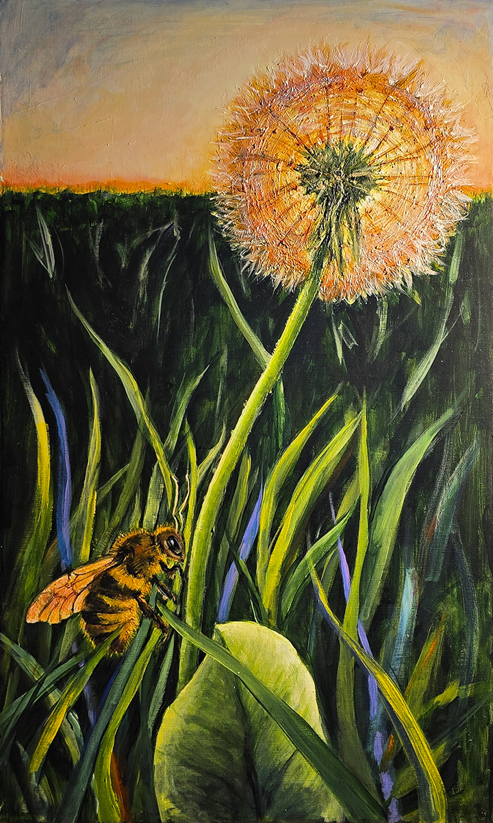 I used acrylic paint, but I also added acrylic texture mixed into the paint. I built up the dandelion, the leaves and the bee. I wanted the viewer to feel like they were a part of the scene. Perhaps from the perspective of the size of an ant.