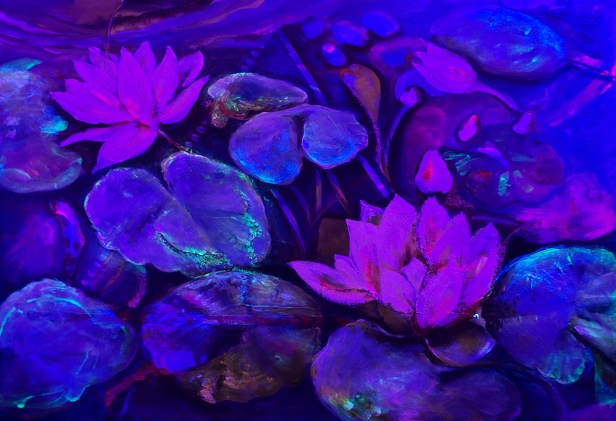 It is challenging to photograph art in black light. The appearance changes depending on the level of light affecting the paint. This black light photo of the painting was taken in complete darkness accept for two black lights aimed at.