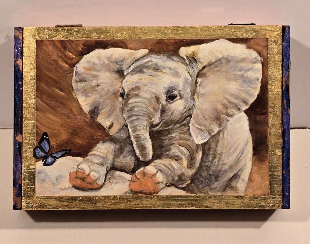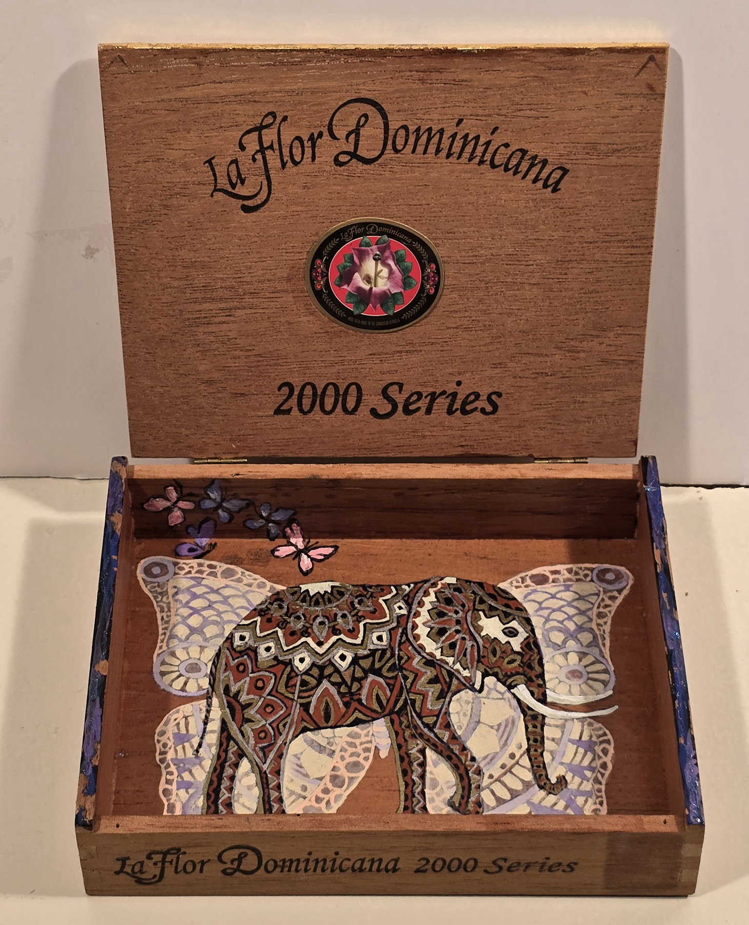 The addition of butterflies in this cigar box was inspired by a beautiful life-size elephant. Besides I love all things elephant.