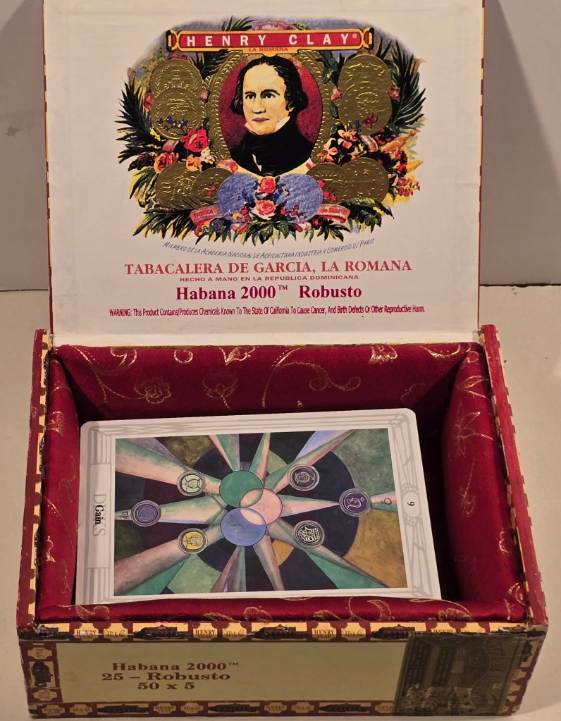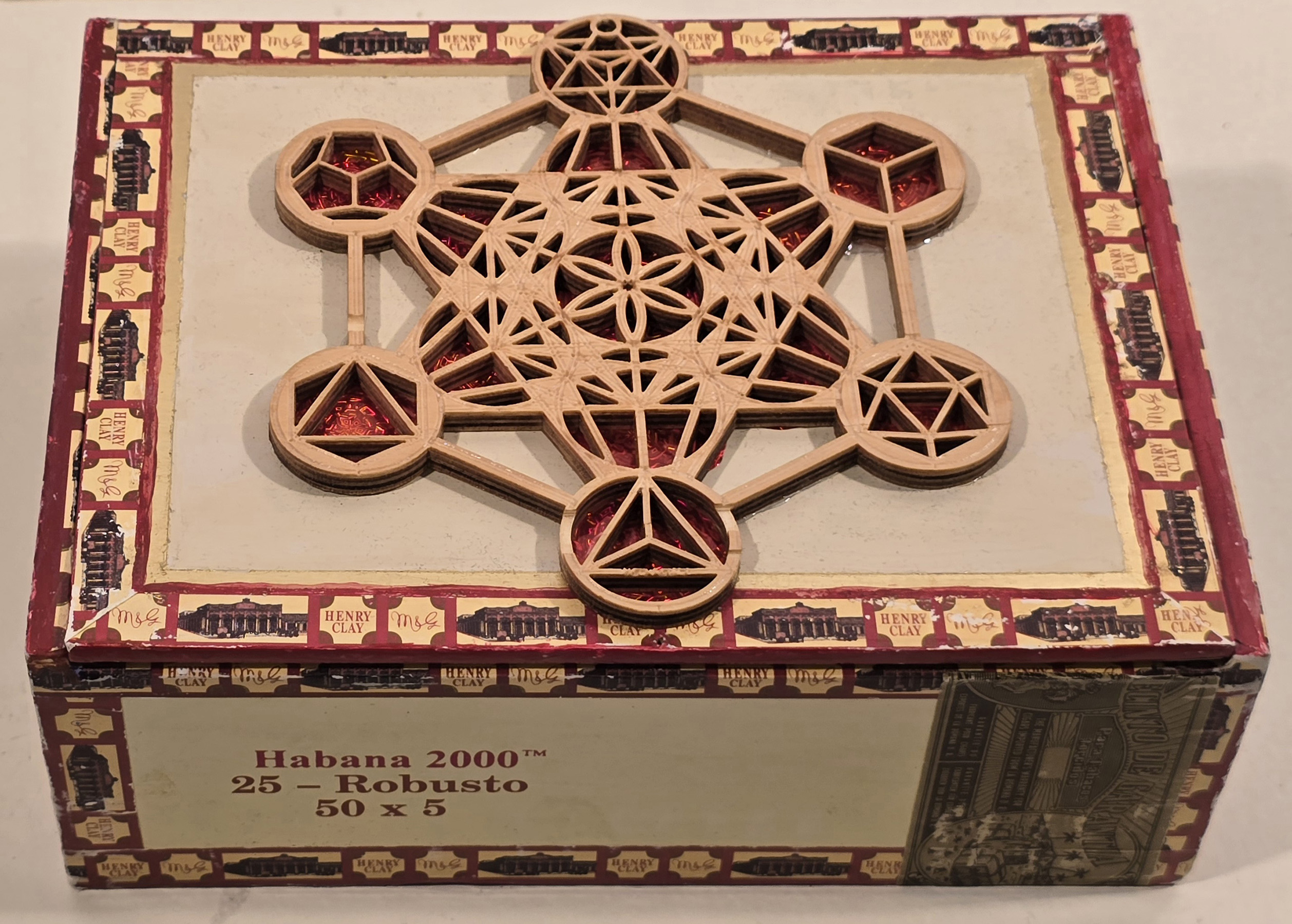 I had this Metatrons cube medallion hanging for a long time in my greenhouse. It seemed to fit perfectly on the cover of this small cigar box.