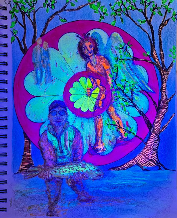 My take away from all of this expended energy is to pack up my wax crayons. I think they might work well in a hot wax application like encaustic. But until I move I don’t have the space for encaustic. The figure in the center where I added wings, makes me think of a seraphim. I like the idea of a Seraphim in a Rose Window. Maybe I will try again. I could make a sacred geometry, spiritual type piece. I would keep the fisherman as the biblical Fisher of men. I learned a lot about my materials. I discovered that white looks pink under black light. I found that wax is a great resist.