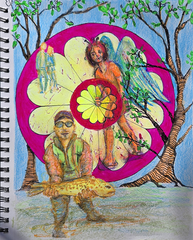 My take away from all of this expended energy is to pack up my wax crayons. I think they might work well in a hot wax application like encaustic. But until I move I don’t have the space for encaustic. The figure in the center where I added wings, makes me think of a seraphim. I like the idea of a Seraphim in a Rose Window. Maybe I will try again. I could make a sacred geometry, spiritual type piece. I would keep the fisherman as the biblical Fisher of men. I learned a lot about my materials. I discovered that white looks pink under black light. I found that wax is a great resist.